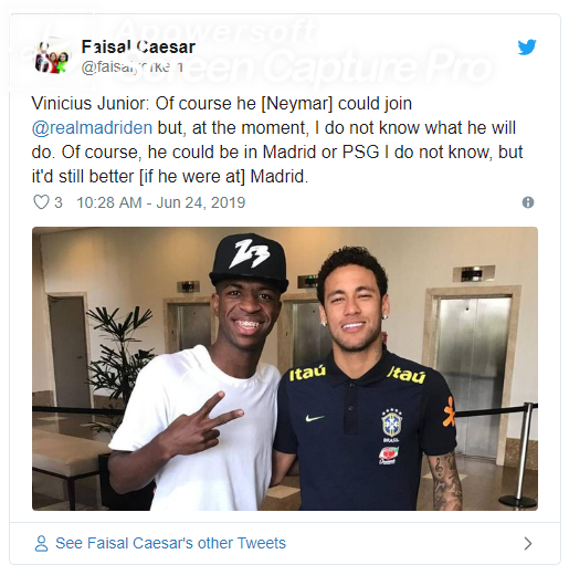 ย้ายจาก ปารีส แซงต์-แชร์กแมง มาค้าแข้งด้วยกันในถิ่น เบอร์นาบิว แน่นอนว่า เนย์มาร์ มีโอกาสย้ายมาอยู่กับเราที่ มาดริด แต่อาจไม่ใช่ตอนนี้ เพราะไม่รู้เหมือนกับว่าเขากำลังคิดอะไรอยู่ วินิซิอุส กล่าว และถึงแม้จะมีข่าวว่าพี่เขาอยากย้ายทีมในซัมเมอร์นี้ แต่ก็อาจอยู่กับ เปแอสเช ต่อไปอีกเช่นกัน ผมไม่มีข้อมูลอะไรมากไปกว่านี้แล้ว แค่อยากให้มาเล่นด้วยกันที่ มาดริด เท่านั้นเอง อีกคนที่อยากให้ย้ายตามกันมาก็คือ คีเลียน เอ็มบัปเป เพราะผมรู้ดีว่าแฟน ๆ ก็ต้องการเห็นเขาสวมชุดแข่งสีขาวของเราลงสนามทุกสัปดาห์ ไม่แน่นะเผลอ ๆ แฟนบอลทีมอื่นจากทั่วโลกเองอาจคิดเหมือนกันอยู่ก็ได้ คุณว่าไหมล่ะ
