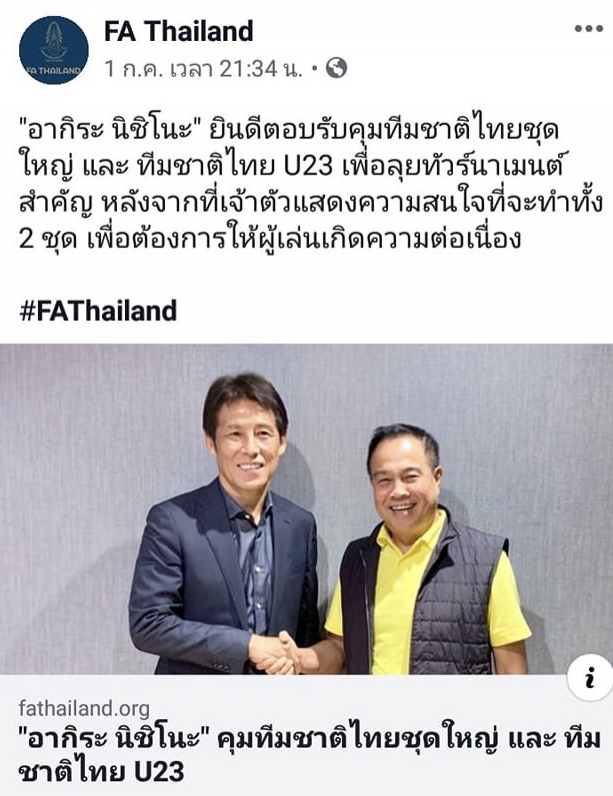 อดีตหัวหน้าผู้ฝึกสอนทีมชาติญี่ปุ่น เมื่อวันที่1 กรกฎาคม ก่อนที่สมาคมฯจะออกข่าวว่า อากิระ นิชิโนะ ได้ตอบรับข้อเสนอในการเป็นหัวหน้าผู้ฝึกสอนฟุตบอลชายทีมชาติไทยชุดใหญ่ในศึกฟุตบอลโลก 2022 รอบคัดเลือกโซนเอเชียและทีมชาติไทยรุ่นอายุไม่เกิน 23 ปีชุดลุยศึกซีเกมส์ 2019 และฟุตบอลชิงแชมป์เอเชียรุ่นอายุไม่เกิน23 ปีรอบสุดท้ายและรอการเซ็นสัญญาอย่างเป็นทางการ Yahoo Japan รายงานจากบทสัมภาษณ์ข่าว ของNikkan Sport โดยนิชิโนะ กล่าวว่าตนไปกินข้าวกับนายกสมาคมฟุตบอลไทยจริง แต่ยังไม่ได้เซ็นสัญญา ยังไม่ได้รับงานนี้ เนื่องจากอยู่ในระหว่างการตกลงรายละเอียดสุดท้ายทั้งเรื่องเงินเดือน และสัญญาการทำงาน ในขณะที่ “โค้ชเฮง” วิทยา เลาหกุลอุปนายกสมาคมกีฬาฟุตบอลฯกล่าวเสริมว่าเป็นสไตล์การทำงานของญี่ปุ่นเพราะยังไม่มีการเซ็นสัญญากัน เพียงแต่มีการเจรจากันเท่านั้น ถ้าทุกอย่างยังไม่ร้อยเปอร์เซ็นต์ก็จะไม่พูดเด็ดขาด