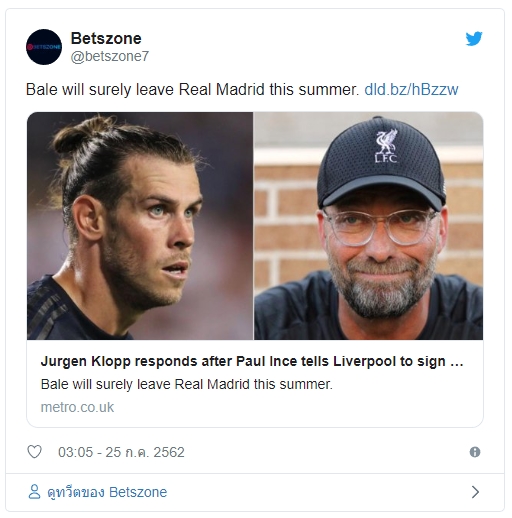 ฟุตบอลพรีเมียร์ลีกอังกฤษ ออกมาตั้งโต๊ะแถลงตอบกลับหลัง พอล อินซ์ แข้งตำนานชาวอังกฤษแนะนำให้ซื้อ แกเร็ธ เบล จาก เรอัล มาดริด เสริมทัพใน ตลาดซื้อขายนักเตะ ซัมเมอร์นี้ เราอยู่ในวงการฟุตบอลมานานมากพอจนเข้าใจได้แล้วล่ะว่า เหล่าผู้เล่นระดับตำนานทั้งหลายมักจะมีไอเดียล้ำ ๆ ออกมาแนะนำอยู่เรื่อย ๆ นั่นแหละ คล็อปป์ กล่าว แน่นอนว่าผมให้ความเคารพพวกเขาอย่างสูงสุดเสมอ แต่บางครั้งเราก็แค่รับฟังไว้เฉย ๆ ไม่จำเป็นต้องทำตามทุกอย่างหรอก เนื่องจากที่แสดงความเห็นออกมาเพราะมีคนไปถามยังไงล่ะ มันเป็นเรื่องของหน้าที่การงานล้วน ๆ ตอนนี้ เบล เป็นนักเตะของ เรอัล มาดริด และถ้าเขาจะย้ายทีมจริงไม่ต้องสืบเลยว่าทั้งค่าตัวและค่าเหนื่อยจะสูงเวอร์ขนาดไหน โดยส่วนตัวผมก็ชอบฝีเท้าของ เบล อยู่แล้วแต่เวลาคุณจะสร้างทีมฟุตบอลเจ๋ง ๆ ขึ้นมเนี่ย มันไม่ได้ขึ้นอยู่กับความสามารถระดับเทพที่นักเตะมีเท่านั้น